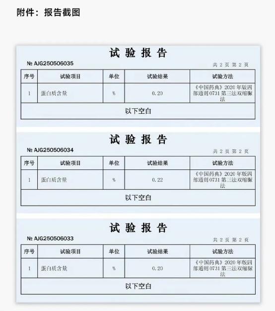 6月4日,巨子生物发布《致每一位信任巨子生物的朋友:关于我司重组胶原蛋白产品检测结果的说明》,其中提到,参考中国医药行业标准(YY/T1947-2025)《重组胶原蛋白敷料》和团体标准(T/ZGKSL 004-2023)《化妆品用重组胶原蛋白原料》中所规定的方法,对多个批次产品进行了定性和定量检测,并展示了分别以A、B、C、D为代称的四家检测机构的相关检测数据,以力证可复美相关产品中真实添加重组胶原蛋白成分,不存虚假宣传、误导消费者行为。