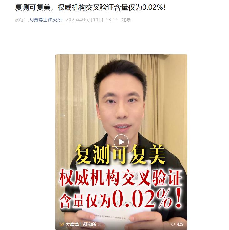 6月11日,美妆博主“大嘴博士”(郝宇)再次发布检测报告,指出可复美胶原棒中重组胶原蛋白含量仅为0.02%。这场始于成分争议的口水战,正式演变为中国医美行业权力格局重构的商战。