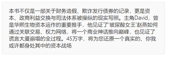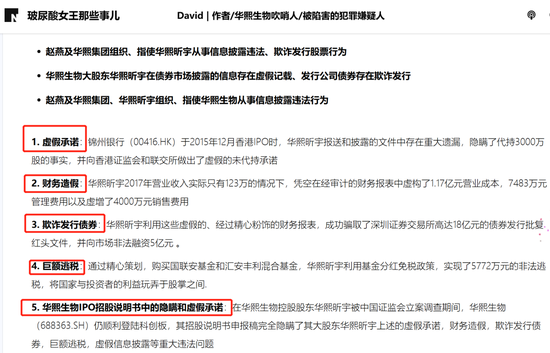 3、相关的网页内容尚未完全披露所谓的45万字书的内容,但大概指向了五点。作者表示,华熙生物涉嫌虚假承诺、财务造假、巨额逃税、IPO招股书隐瞒和虚假承诺。