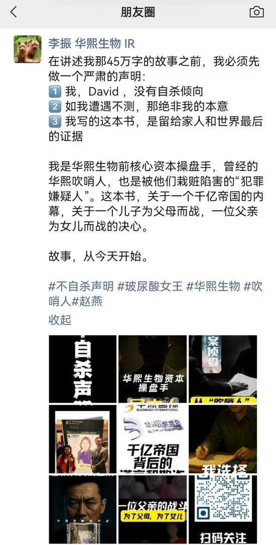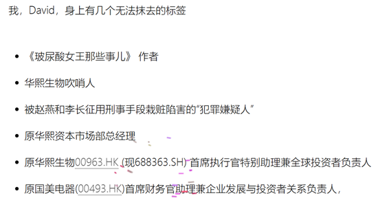 1、这个事情昨晚就开始在出现在社交媒体上,最开始是一张截图。截图主角自称是华熙生物前核心资本操盘手,曾经的华熙吹哨人,也是被陷害的嫌疑人。45万字的故事,是“关于一个千亿帝国的内幕”。