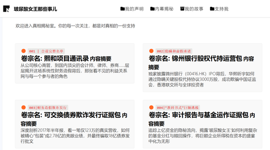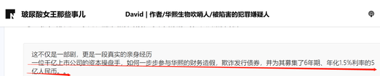 从网页内容来看,这些内容出自华熙生物前资本市场部总经理。作者表示,其是在玻尿酸女王的策划下,亲自参与华熙生物财务造假欺诈发行债权。