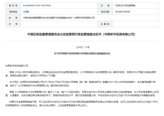 2020年1月,证监局向华熙昕宇下发了一则《关于对华熙昕宇投资有限公司采取出具警示函措施的决定》,提到在《华熙昕宇投资有限公司2017年非公开发行可交换公司债券(第一期)募集说明书》披露的2017年上半年财务数据中,成本费用披露不准确,违反了《公司债券发行与交易管理办法》第四条的相关规定。