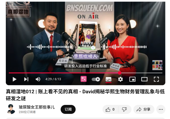 8月9日当晚,YouTube的ID名为“玻尿酸女王那些事儿”,在YouTube更新了两期视频“真相湿地012 |账上看不见的真相- David揭秘华熙生物财务管理乱象与低研发之谜”与“真相湿地013 |三张表,三场博弈—David如何重构华熙生物投资者关系与数据迷局”。
