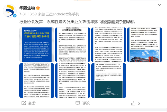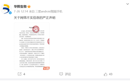 7月26日,华熙生物微博发布《关于网络不实信息的严正声明》称,昨日晚间发现部分网络平台用户发布关于公司的严重不实信息。经核实,信息发布于境外网站,内容纯属捏造,恶意歪曲事实,其中部分内容涉及政治谣言,性质极其恶劣。