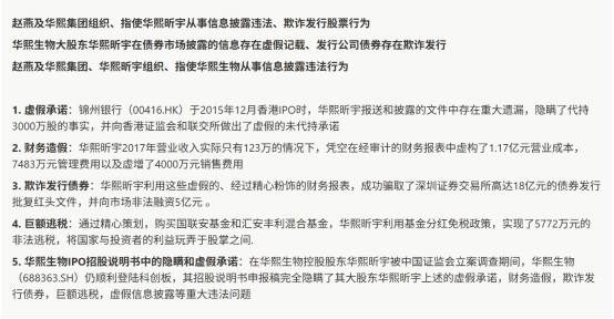 1.虚假承诺:锦州银行(00416.HK)于2015年12月香港IPO时,华熙昕宇报送和披露的文件中存在重大遗漏,隐瞒了代持3000万股的事实,并向香港证监会和联交所做出了虚假的未代持承诺。