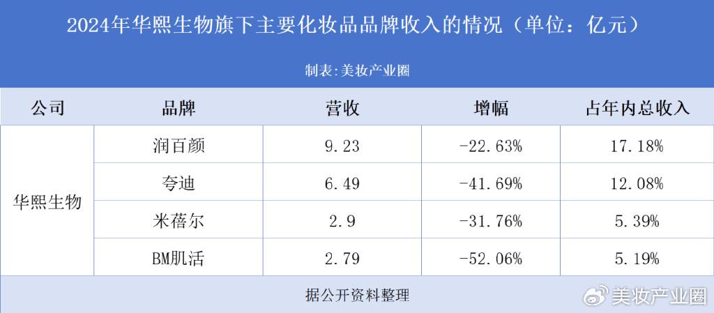 据美妆产业圈梳理,2024年华熙生物旗下四大主力品牌润百颜、夸迪、米蓓尔、BM肌活,营收分别为9.23亿、6.49亿、2.9亿、2.79亿,较上一年下滑22.63%、41.69%、31.76%、52.06%。