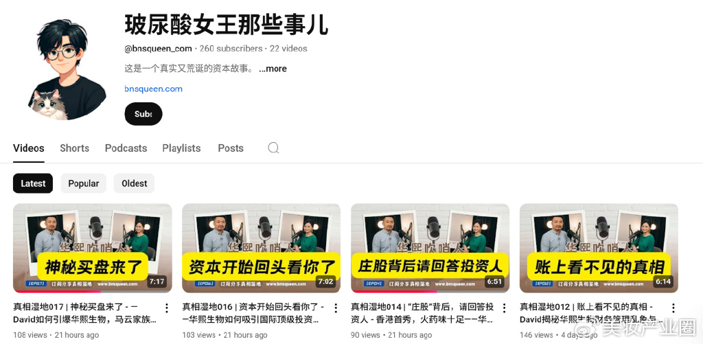 昨日(8月12日)晚,YouTube账号“玻尿酸女王那些事”连续发布三条标号为“真相湿地014-017”的系列视频,再次指控华熙生物存在财务造假,以及其如何吸引国际顶级投资等行为。