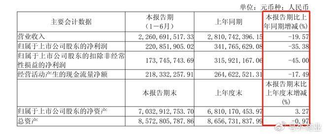 上半年,华熙生物营收仅22.61亿元,较去年同期的28.11亿元大幅缩水近6亿元;归母净利润2.21亿元,较去年同期的3.42亿元少赚1.21亿元,降幅超三成。