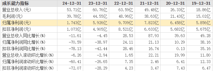 华熙生物2022年到2024年净利连续下降,归母净利润分别为9.709亿元、5.926亿元、1.743亿元,扣非净利润分别为8.521亿元、4.905亿元、1.073亿元。