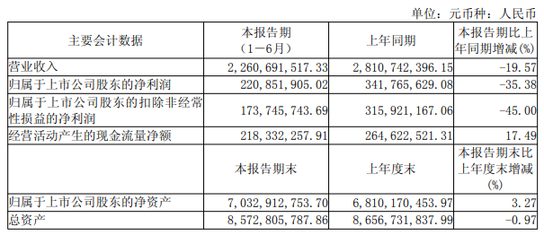 华熙生物(688363.SH)近期发布2025年半年度报告。2025年上半年,公司实现营业收入22.61亿元,同比下滑19.57%;归属于上市公司股东的净利润2.21亿元,同比下滑35.38%;归属于上市公司股东的扣除非经常性损益的净利润1.74亿元,同比下滑45.00%;经营活动产生的现金流量净额为2.18亿元。