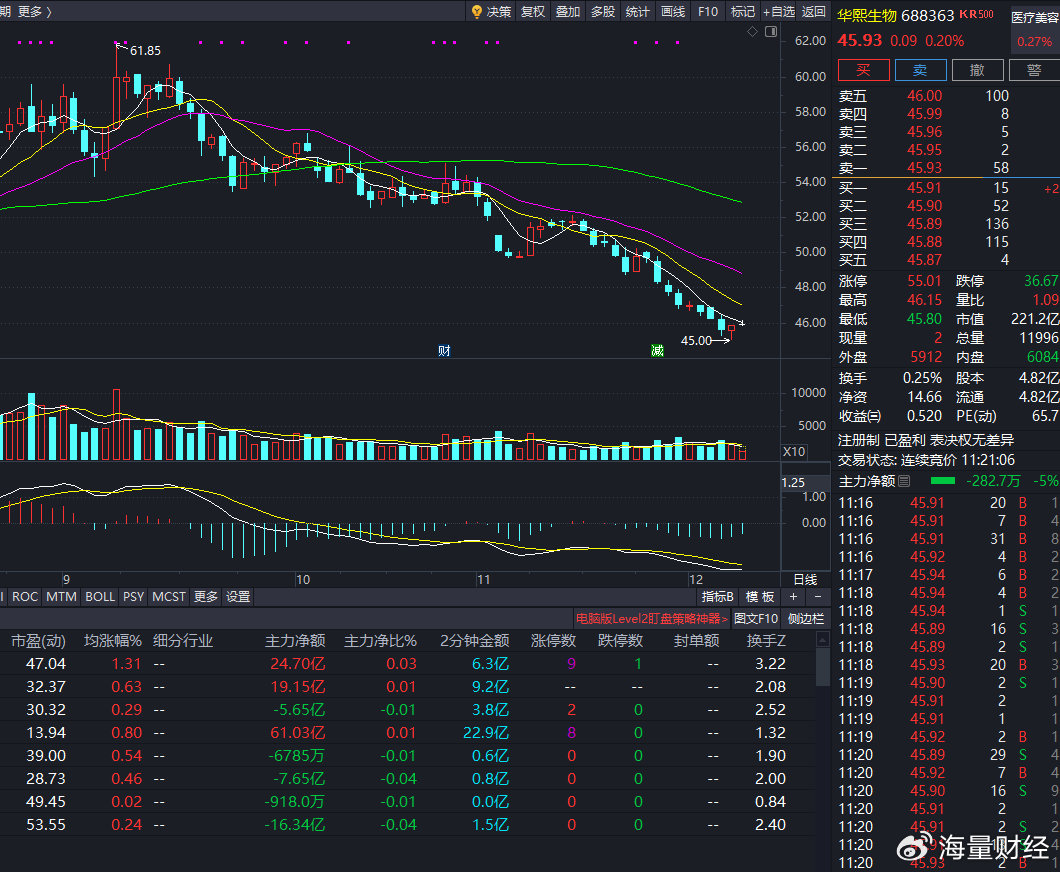 12月8日,科创板"玻尿酸龙头" 华熙生物 科技股份有限公司盘中股价跌倒45.,跌破47.79元的发行价,较2021年308.77元的历史峰值暴跌85.2%,市值蒸发超1180亿元。更严峻的是,12月12日收市后, 华熙生物 将被正式剔除科创50指数样本,标志着其"科创板标杆企业"地位的丧失。在当日的三季度业绩说明会上,董事长赵燕面对投资者"如何扭转跌势"的追问时坦言,股价波动是"宏观环境、行业政策与市场情绪共振的结果",而公司的应对之策是"回归主营业务,用扎实业绩重建信心"。