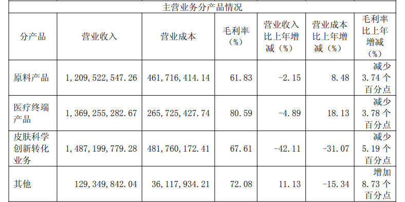 除皮肤科学创新转化业务外,医疗终端业务也在调整中呈现新的变化。期内该业务收入13.69亿元,同比下降4.89%,占公司主营业务收入的32.64%。其中,皮肤类医疗产品实现收入9.38亿元,同比下降12.55%。收入下降主要系行业竞争持续加剧、市场新品迭代速度加快所致。