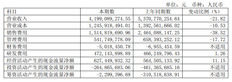 与之对应的,公司销售费用录得15.15亿元,同比降低38.52%。该费用的变化主要系期内公司对皮肤科学创新转化业务进行战略调整,逐步优化品牌推广、营销渠道,渠道及推广宣传费同比降低52.86%。