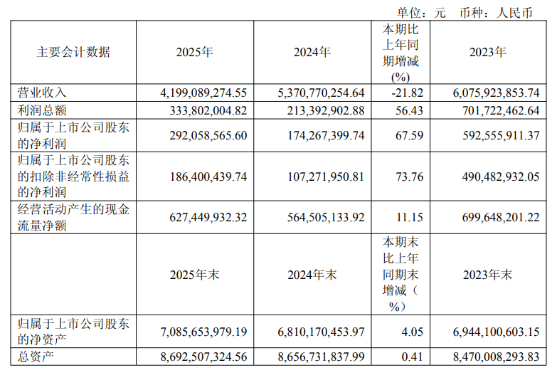 4月22日晚,华熙生物公布了2025年全年业绩。财报显示,期内,公司实现营收41.99亿元,同比下滑21.82%;归母净利润不降反增,同比上涨67.59%至2.92亿元;扣非归母净利润同比大涨73.76%至1.86亿元。