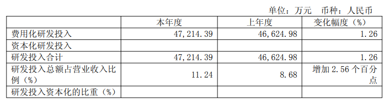 在研发投入方面,2025年,公司研发支出4.72亿元,同比增长1.26%,投入总额占营业收入比例为11.24%。