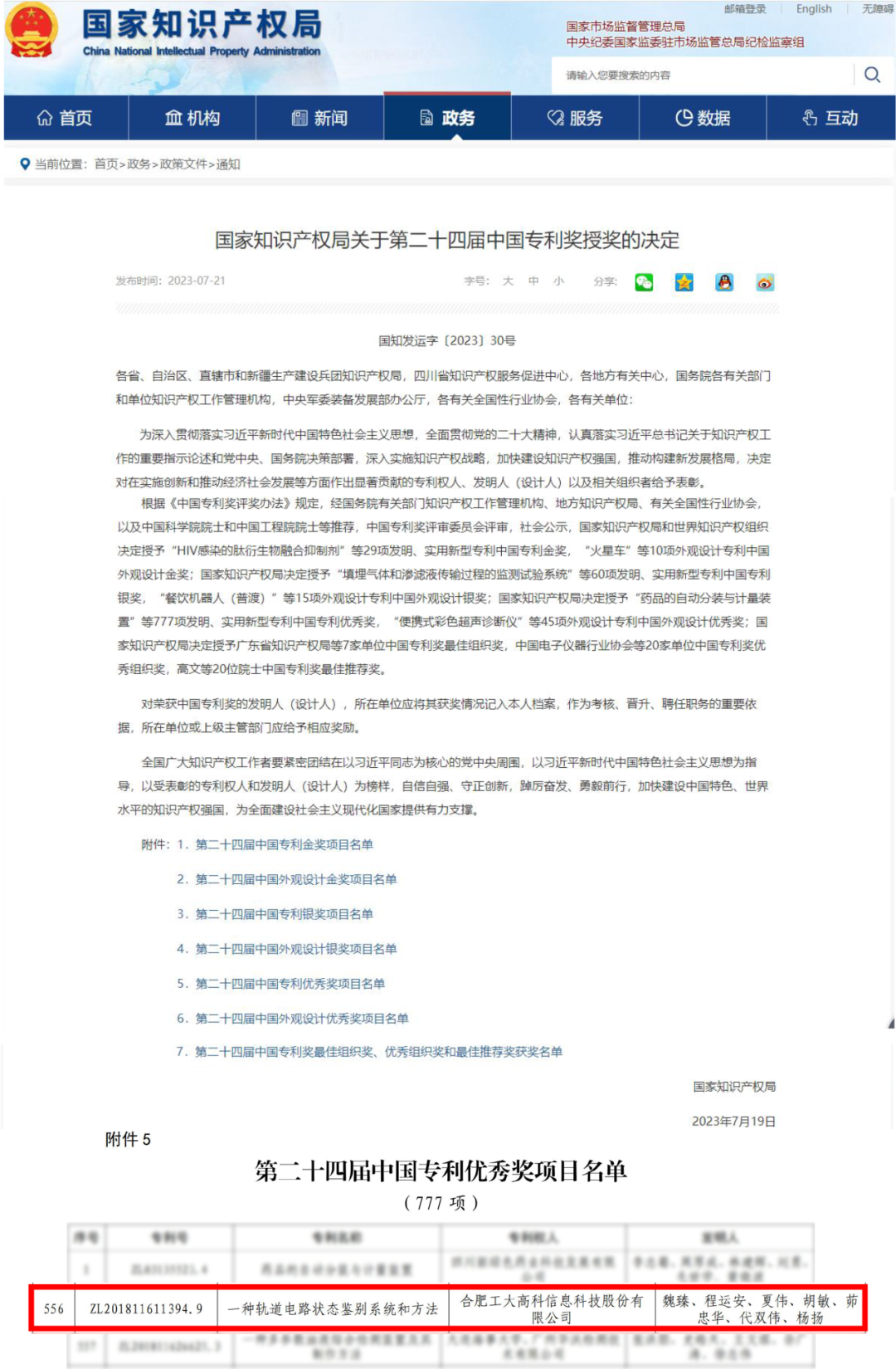 近日,国家知识产权局发布《国家知识产权局关于第二十四届中国专利奖授奖的决定》,工大高科发明专利“一种轨道电路状态鉴别系统和方法”获得第二十四届中国专利优秀奖,这是工大高科再次摘得中国专利奖项,充分体现了在铁路信号控制与调度领域的研发实力和创新能力。