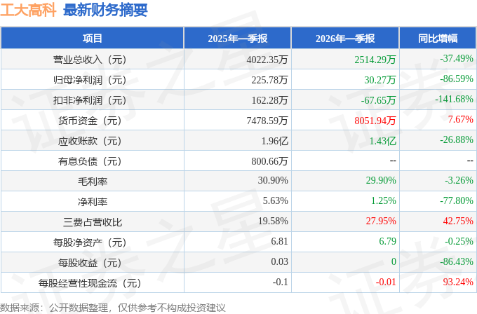 据公开数据整理,近期工大高科(688367)发布2026年一季报。截至本报告期末,公司营业总收入2514.29万元,同比下降37.49%,归母净利润30.27万元,同比下降86.59%。按单季度数据看,第一季度营业总收入2514.29万元,同比下降37.49%,第一季度归母净利润30.27万元,同比下降86.59%。本报告期工大高科三费占比上升明显,财务费用、销售费用和管理费用总和占总营收同比增幅达42.75%。