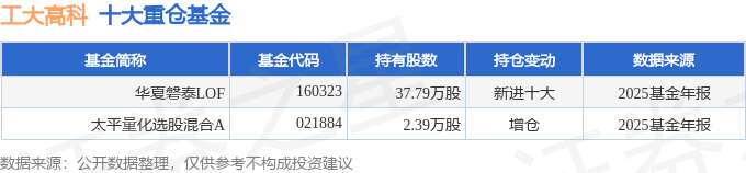 持有工大高科最多的基金为华夏磐泰LOF,目前规模为16.98亿元,最新净值1.7617(4月23日),较上一交易日下跌0.32%,近一年上涨8.96%。该基金现任基金经理为张城源毛颖。