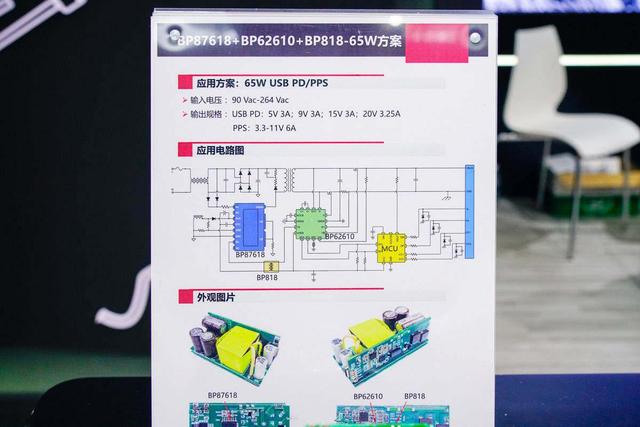 晶丰明源展出了一款33W的PD快充应用实例,这款方案支持85~264Vac输入,输出支持5V3A,9V3A,15V2A,20V1.5A,支持PPS3.3~11V3A输出。方案采用BP87526+BP62610+BP818芯片方案。在90Vac输入时,满载效率高于90%。