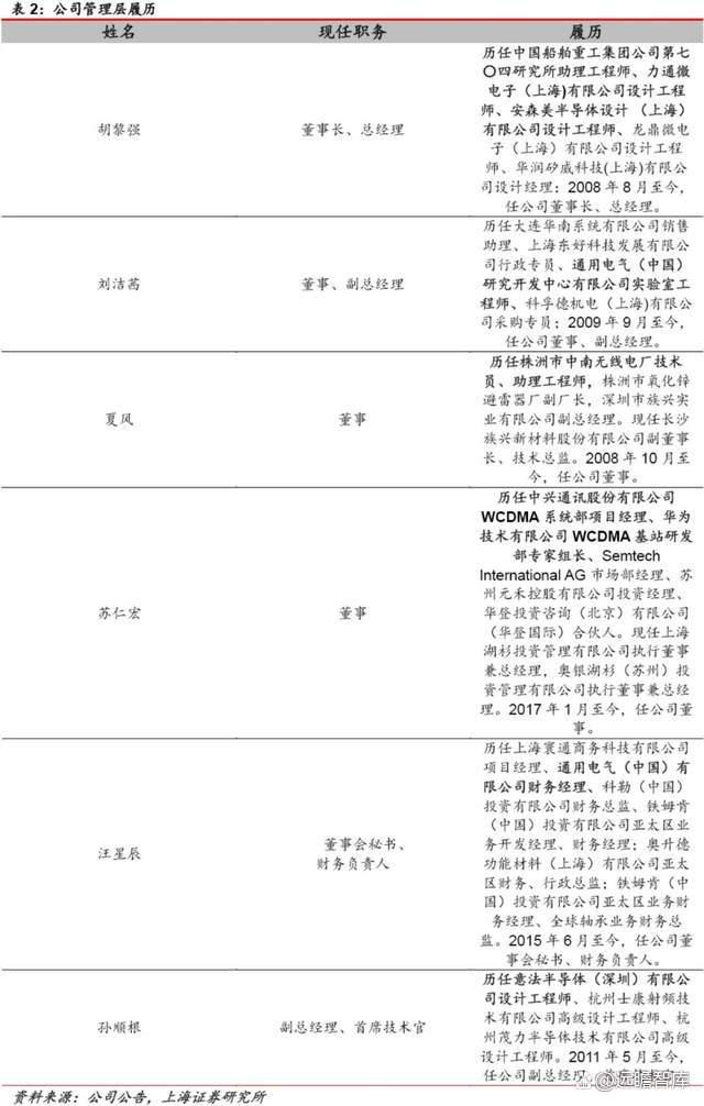 公司管理层均在国内外知名企业内有丰富的从业经验,例如意法半导体、安森美、通用电气、中兴通讯等企业,公司创始人之一胡黎强先生,曾荣获“上海市领军人才”、“第八届上海科技企业家创新奖”等荣誉。