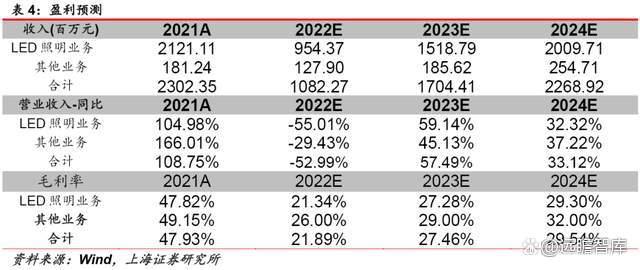 一方面,公司持续消化自身库存,计划在年底恢复到健康水平,LED通用照明业务毛利率将逐步回升至历史平均水平;另一方面,公司顺应行业发展趋势,积极布局智能LED照明业务,应用领域升维,故我们预计2022-2024年LED照明业务收入增速分别为-55.01%/+59.14%/+32.32%,毛利率为21.34%/27.28%/29.30%。