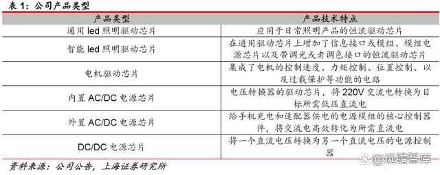 公司现有产品包括 LED 照明驱动芯片、电机驱动芯片、AC/DC 电源芯片、DC/DC 电源芯片等,其中 LED 照明驱动芯片包括通用 LED 照明驱动芯片、智能 LED照明驱动芯片;AC/DC电源管理芯片包括内置 AC/DC电源芯片及外置 AC/DC 电源芯片。