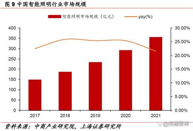 根据中商产业研究院数据显示,2021年中国智能照明行业市场规模将超过350亿元,相对于 2017年市场规模147亿元,复合增长率达到24.6%。
