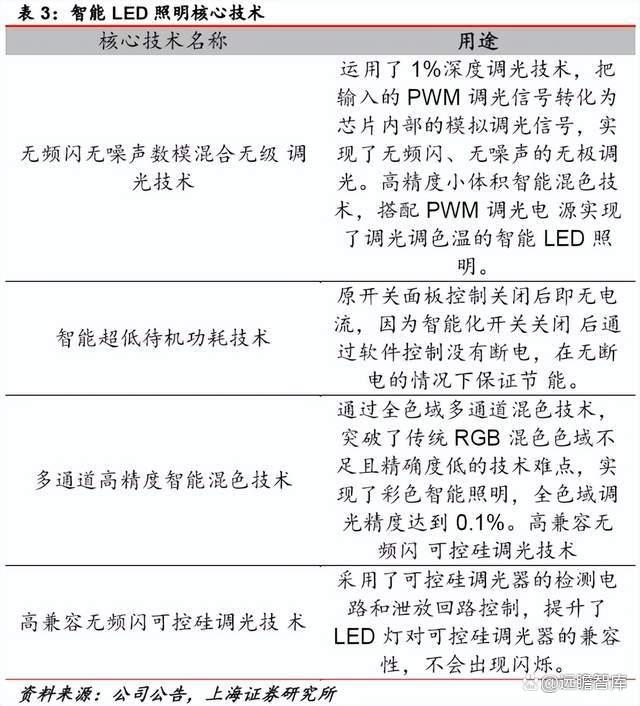 公司相继攻克了无频闪无噪声数模混合无级调光技术、智能超低待机功耗技术、多通道高精度智能混色技术、高兼容无频闪可控硅调光技术等具有行业领先性的关键技术,应用该等技术开发的智能 LED 照明芯片可以实现 1%的精准调光,另外低功耗待机电源可满足无线智能控制模块的精准供电需求,并将待机功耗降低至行业领先的 2 毫瓦水平。上述技术的突破使得智能照明产品真正具备了成为物联网节点的基础条件。