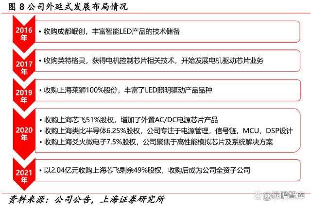 公司2016年收购成都岷创丰富智能LED产品的技术储备,2017年收购英特格灵从而开展了电机驱动芯片业务,2019年通过收购上海莱狮丰富了LED照明驱动产品品种,与公司原有照明业务形成共振。