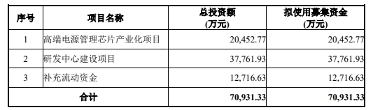 本次发行的可转债所募集资金总额不超过人民币70,931.33万元(含本数),扣除发行费用后,募集资金拟用于以下项目:高端电源管理芯片产业化项目、研发中心建设项目、补充流动资金。