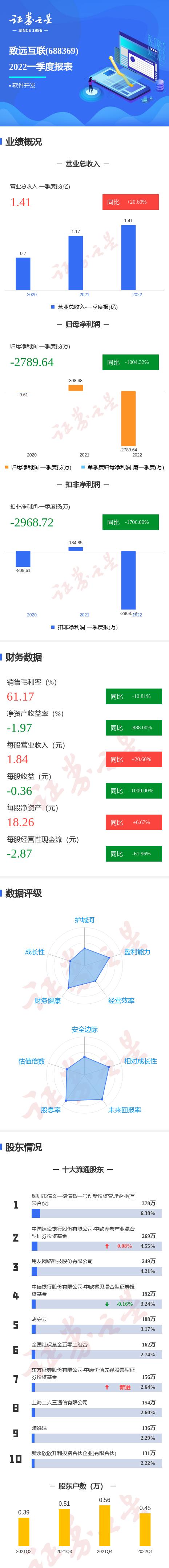 致远互联2022一季报显示,公司主营收入1.42亿元,同比上升20.6%;归母净利润-2789.64万元,同比下降1004.32%;扣非净利润-2968.72万元,同比下降1706.0%;其中2022年第一季度,公司单季度主营收入1.42亿元,同比上升20.6%;单季度归母净利润-2789.64万元,同比下降1004.32%;单季度扣非净利润-2968.72万元,同比下降1706.0%;负债率23.29%,投资收益106.72万元,财务费用-692.08万元,毛利率61.17%。