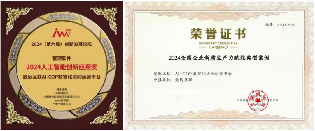 6月28日,由中国科学院《互联网周刊》、中国社会科学院信息化研究中心、eNet研究院、德本咨询联合主办的2024(第六届)创新发展论坛金i奖正式公布,致远互联凭借一体化、数智化的AI-COP协同运营平台,荣获“2024人工智能创新应用奖”与“2024全国企业新质生产力赋能典型案例”双料殊荣。