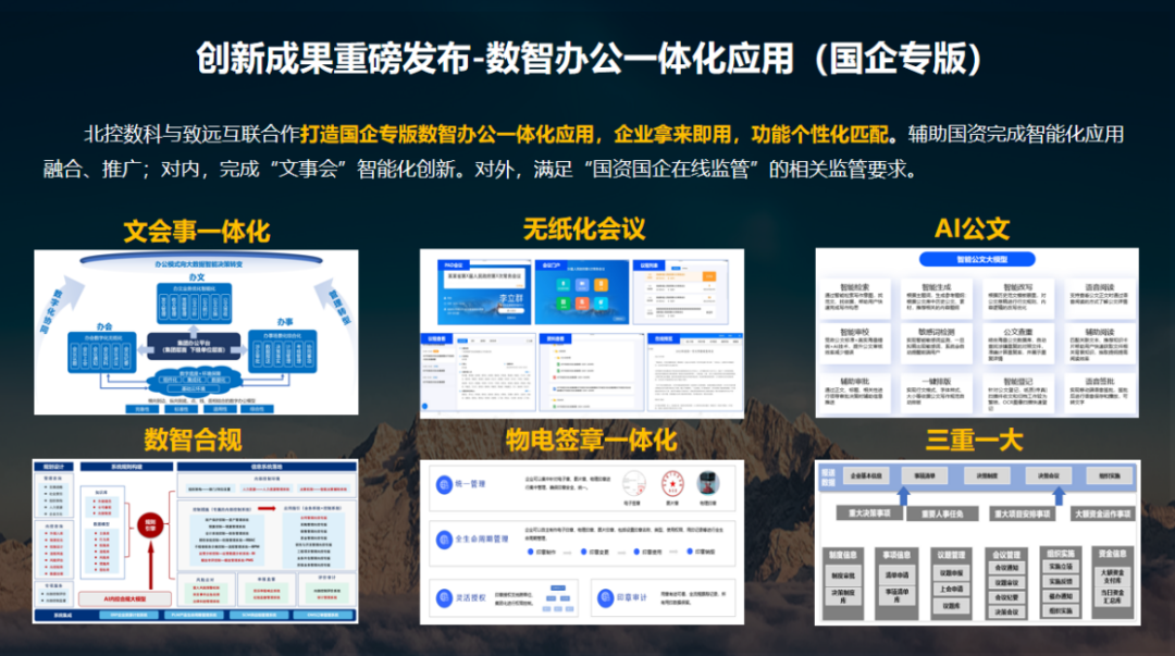 会上,国企数字协同创新云平台(国企云)的创新成果正式发布。其中,致远互联与北控数科合作打造的国企专版数智办公一体化应用在会上亮相。该应用为市属企业量身打造,辅助国资完成智能化应用融合、推广;对内,完成“文事会”智能化创新;对外,满足“国资国企在线监管”的相关监管要求,为国资企业提供一站式专属业务应用与坚实保障服务。