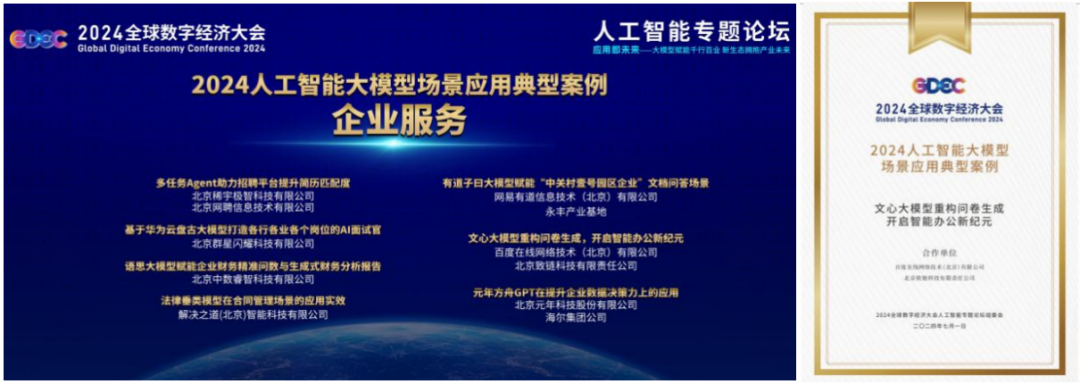 在“2024全球数字经济大会——人工智能专题论坛”上,致远互联凭借旗下AI原生应用产品iForm?智能表单,以百度文心大模型重构问卷生成,开启智能办公新纪元,入选“2024人工智能大模型场景应用典型案例”。