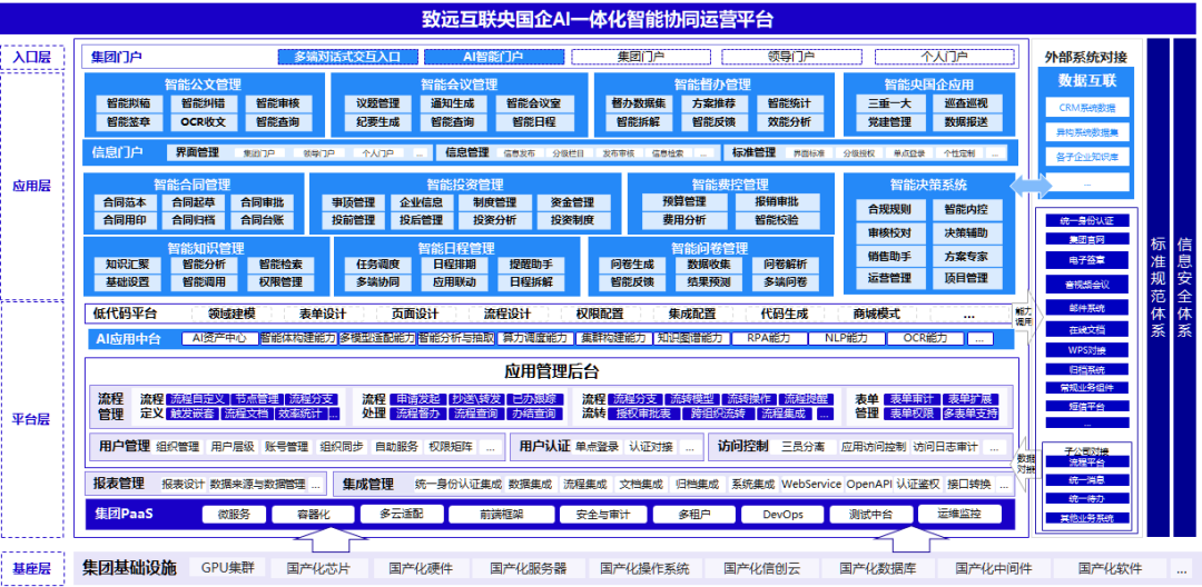 在国家大力推进“AI+”战略与数字化转型的背景下,央国企已基本完成基础办公业务的信创替代,逐步加速智能化升级。作为协同运营管理领域的领军企业,致远互联积极响应国家战略,提出以“AI能力服务化、场景智能化、生态协同化”为核心,为央国企提供了从统建平台到业务赋能的的全链路解决方案,通过构建可成长、可复用的智能平台,助力央国企实现业务流程重构、管理效能提升与决策智能化突破,赋能其高质量发展。