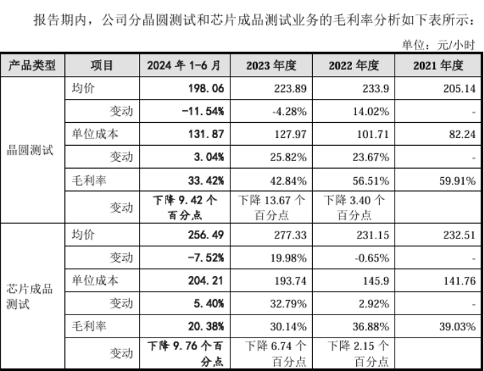 同一时期,芯片成品测试的毛利率为39.03%、36.88%、30.14%和20.38%,呈现逐年下降的趋势,2022年的毛利率较2021年有所下降,主要因为2021年芯片成品测试主要以高端测试为主,2022年随着盈利能力相对较低的中端测试占比上升,该类产品的销售均价下降,而单位成本没有同比例下降,从而导致毛利率略有下降。2023年及2024年上半年,芯片成品测试的毛利率下降较为明显,2023年及2024年上半年芯片成品测试的销售均价整体较以前年度有所上升,主要是因为行业进入下行周期,公司收入结构中销售均价较低的中端测试占比下降,高端测试占比上升所致,但由于公司新增产能较大,产能利用率下降明显,单位成本上升幅度远大于均价,从而导致毛利率分别下降6.74个百分点及9.76个百分点。