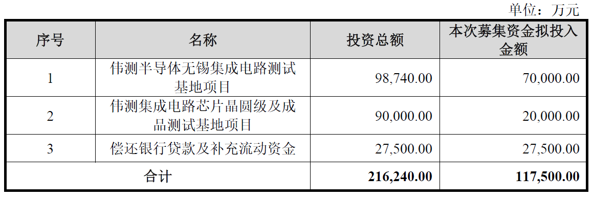 根据募集说明书,此次伟测科技拟向不特定对象发行可转换公司债券的募集资金总额不超过人民币11.75亿元(含本数)。其中,其中7亿元用于伟测半导体无锡集成电路测试基地项目,2亿元用于伟测集成电路芯片晶圆级及成品测试基地项目,另有2.75亿元用于偿还银行贷款及补充流动资金。