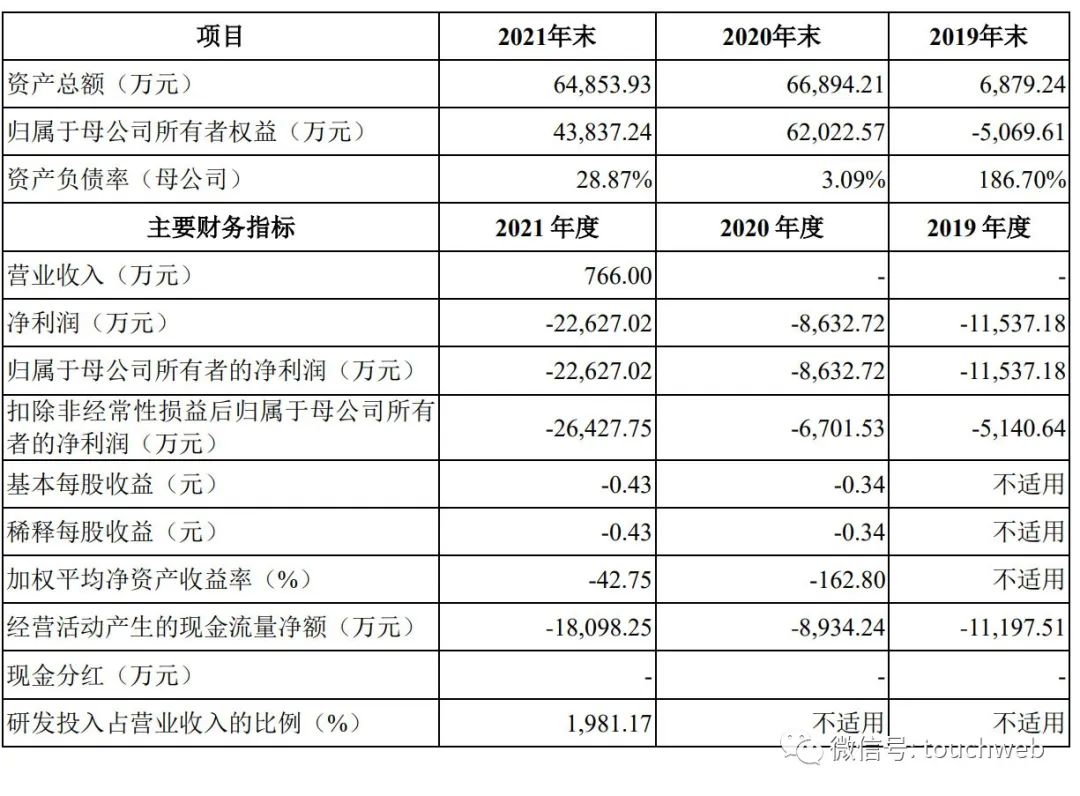 招股书显示,盟科药业2019年、2020年无营收,2021年营收为766万元;净亏损分别为1.15亿元、8632.7万元、2.26亿元;扣非后净亏损分别为5140.64万元、6701.53万元、2.64亿元。