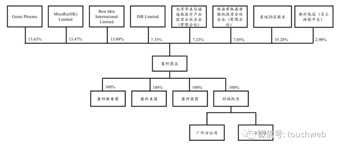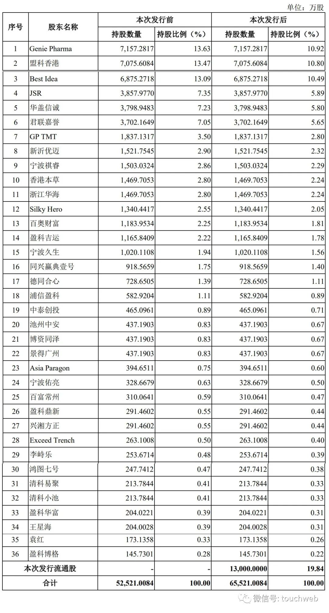 IPO前,Genie Pharma持股为13.63%,盟科香港持股为13.47%,Best Idea持股为13.09%,JSR持股为7.35%,华盖信诚持股为7.23%,君联嘉誉持股为7.05%,GP TMT持股为3.5%,新沂优迈持股2.9%,宁波祺睿持股2.86%;
