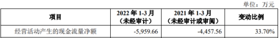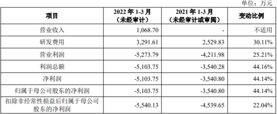2022年1-3月,公司实现营业收入1,068.70万元,上年同期为0万元;归属于母公司所有者的净利润分别为-5,103.75万元,上年同期为-3,540.80万元;扣除非经常性损益后归属于母公司股东的净利润为-5,540.13万元,上年同期为-4,539.65万元;经营活动产生的现金流量净额为-5,959.66万元,上年同期为-4,457.56万元。