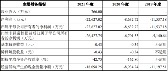 2019年至2021年,盟科药业的营业收入分别为0万元、0万元、766.00万元;归属于母公司所有者的净利润分别为-11,537.18万元、-8,632.72万元、-22,627.02万元;扣除非经常性损益后归属于母公司所有者的净利润分别为-5,140.64万元、-6,701.53万元、-26,427.75万元;经营活动产生的现金流量净额分别为-11,197.51万元、-8,934.24万元、-18,098.25万元。