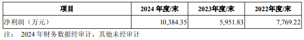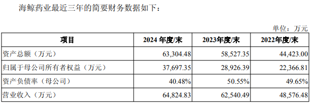 2022年至2024年,海鲸药业营业收入分别为48,576.48万元、62,540.49万元、64,824.83万元,净利润分别为7,769.22万元、5,951.83万元、10,384.35万元。