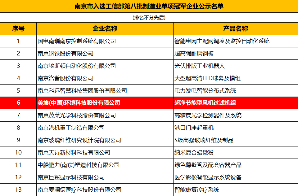 近日,工信部公示《关于第八批制造业单项冠军企业和通过复核的第二批、第五批制造业单项冠军企业名单》,美埃科技成功入选工信部第八批制造业单项冠军企业。