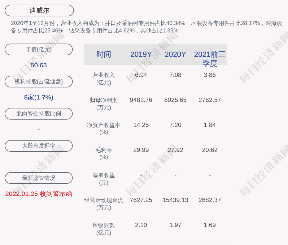 2020年1至12月份,迪威尔的营业收入构成为:井口及采油树专用件占比40.34%,压裂设备专用件占比28.17%,深海设备专用件占比25.46%,钻采设备专用件占比4.62%,其他占比1.35%。