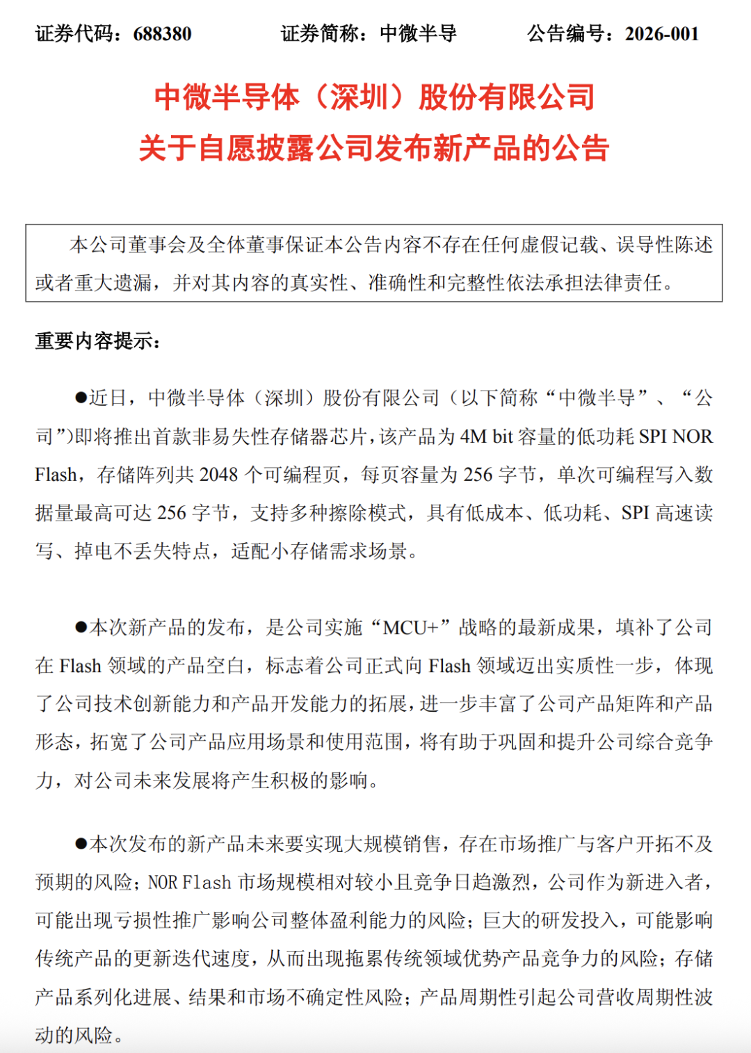 2026年1月20日,中微半导(证券代码:688380)发布公告,宣布推出首款非易失性存储器芯片CMS25Q40A,系4M bit低功耗SPI NOR Flash,填补公司Flash领域空白。