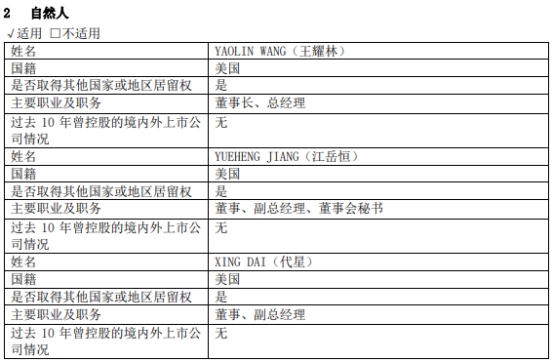 YAOLIN WANG(王耀林),1963年生,美国国籍,拥有中国境内永久居留权,毕业于美国纽约州立大学石溪分校药理学专业,博士学历。1992年至1997年,于美国贝勒医学院进行了博士后研究;1997年至2009年,于美国先灵葆雅公司任主任科学家;2009年至2015年,于美国默沙东公司任主任科学家;2015年至今,任公司总经理;2017年至今,任公司董事长。