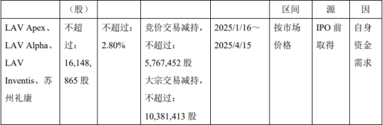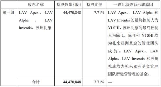 截至公告披露日,LAV Apex持有公司股份24,079,222股,占公司总股本的4.18%;LAV Alpha持有公司股份12,039,582股,占公司总股本的2.09%;LAV Inventis持有公司股份5,224,627股,占公司总股本的0.91%;苏州礼康持有公司股份3,127,417股,占公司总股本的0.54%。上述股东为一致行动人,合计持有公司股份44,470,848股,占公司总股本的7.71%。