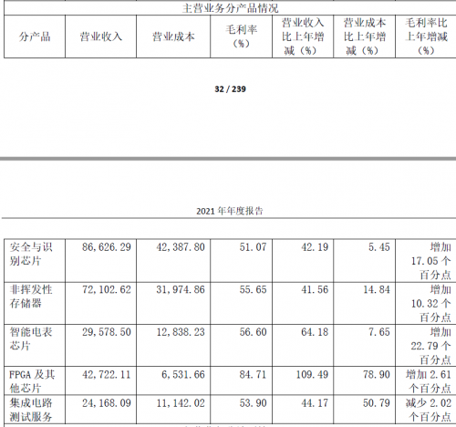 在毛利率方面,安全与识别芯片毛利率增加17.05个百分点;非挥发性存储器毛利率增加10.32个百分点;智能电表芯片毛利率增加22.79个百分点;FPGA及其它芯片毛利率增加2.61个百分点;集成电路测试服务毛利率减少2.02个百分点。