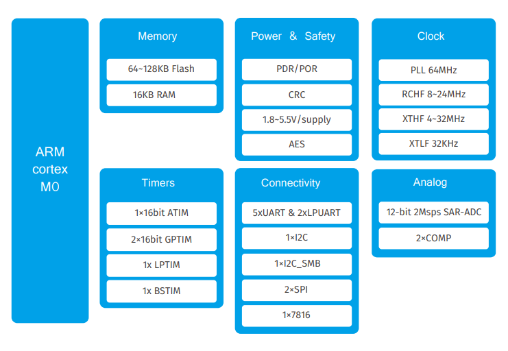 该系列MCU是基于ARM Cortex-M0内核的32位低功耗MCU芯片,最高主频为64MHz,提供最大128KB FLASH程序存储空间,搭配 16KB RAM;片上集成LCD驱动、带温补的RTC、SAR-ADC、AES加密,以及丰富的通用外设接口;支持多种封装形式,包括:LQFP64/ LQFP48/ QFN32/ TSSOP24.其主要特性如下: