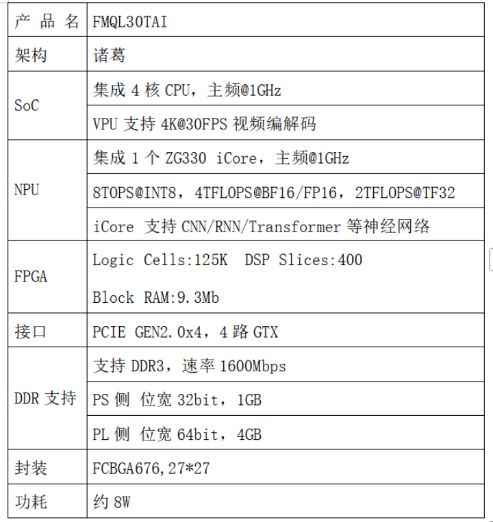 复旦微电子FMQL30TAI-悟净开发板,主芯片采用国产全新一代FPAI芯片--FMQL30TAI(以下简称“30TAI”)。该芯片内部集成了4核处理器系统(Processing System,PS),负责系统级控制与通用浮点计算;集成了全新一代诸葛架构神经网络处理器(Neural Processing Unit,NPU),原生支持Transformer,负责高效AI计算;集成125K的可编程逻辑(Programmable Logic,PL),负责传感器数据预处理和定制化功能扩展。通过异构协同机制,30TAI单芯片即可满足端侧智能应用全流程计算需求,包括预处理、AI推理和后处理三个阶段,具备集成度高、小型化、高能效、高可靠性等优势,搭配全自主设计软件工具链Icraft,可应用于智能传感器、智能算力子卡、可穿戴设备、多模态信息处理等场景,30TAI详细技术指标如下表所示。